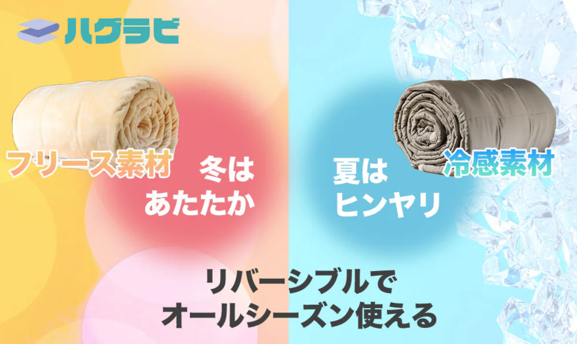 加重ブランケットと聞くと、「冬は良いけれど夏は暑くて使えないのでは?」と心配される方が多くいらっしゃいます。しかし、ハグラビは日本の四季に合わせて快適に使えるよう、両面で異なる素材を採用しています。