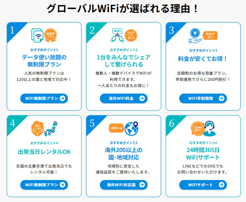グローバルWiFiなら渡航直後からスムーズに利用でき、SIMカード交換の手間も不要です。