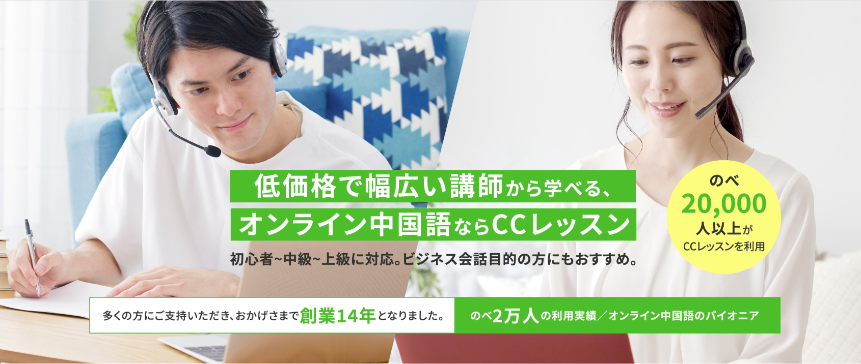 CCレッスンは、自宅で手軽に中国語を学べるオンライン語学講座です。中国語学習を始めたい初心者から、ビジネスシーンで通用する高い会話力を目指す中上級者まで、幅広いレベルに対応しています。「発音が難しい」「続けられるか不安」といった中国語学習の壁を、マンツーマンレッスンと丁寧なサポートで解消してくれるサービスです。
