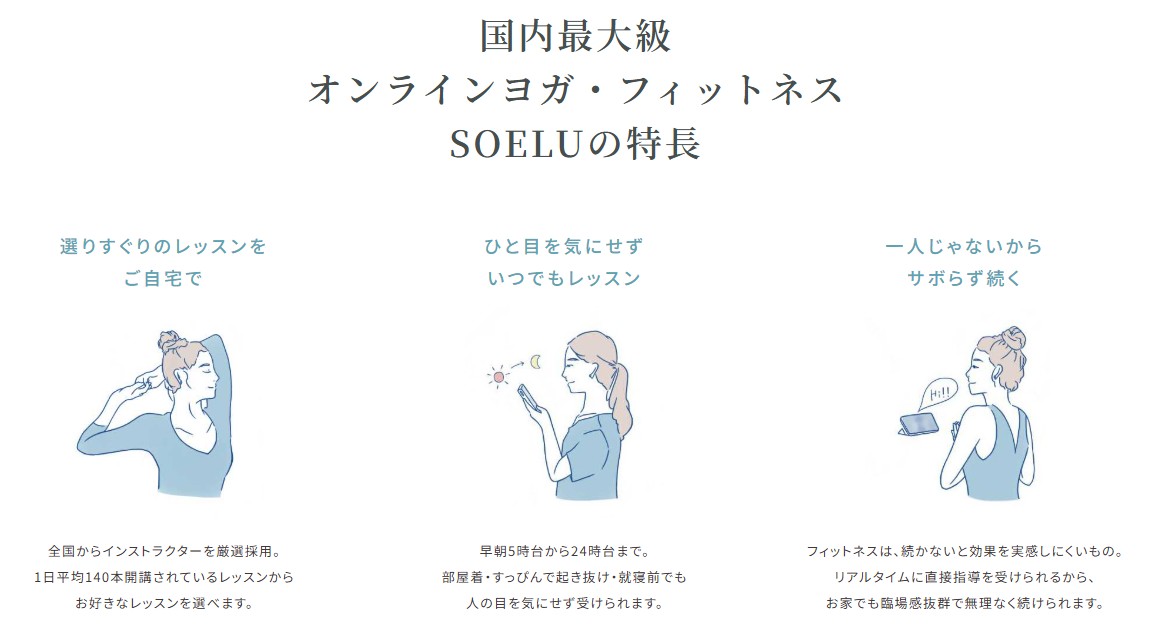 そんな「自宅フィットネスの弱点」を克服し、まるでスタジオに通っているかのような臨場感と指導を提供してくれるサービスがあります。それが、国内最大級のオンラインヨガ・フィットネス「SOELU(ソエル)」です。