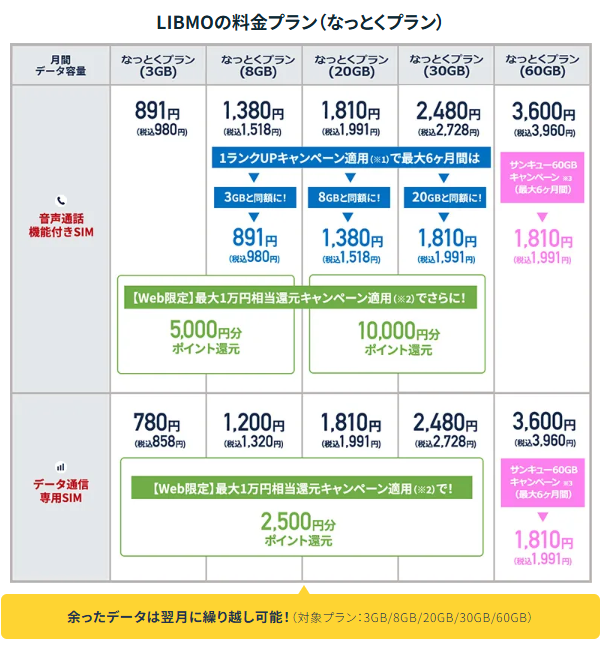 LIBMOの最大の魅力は、その料金設定にあります。特に「なっとくプラン」は、ライトユーザーからヘビーユーザーまで納得の価格を実現しています。