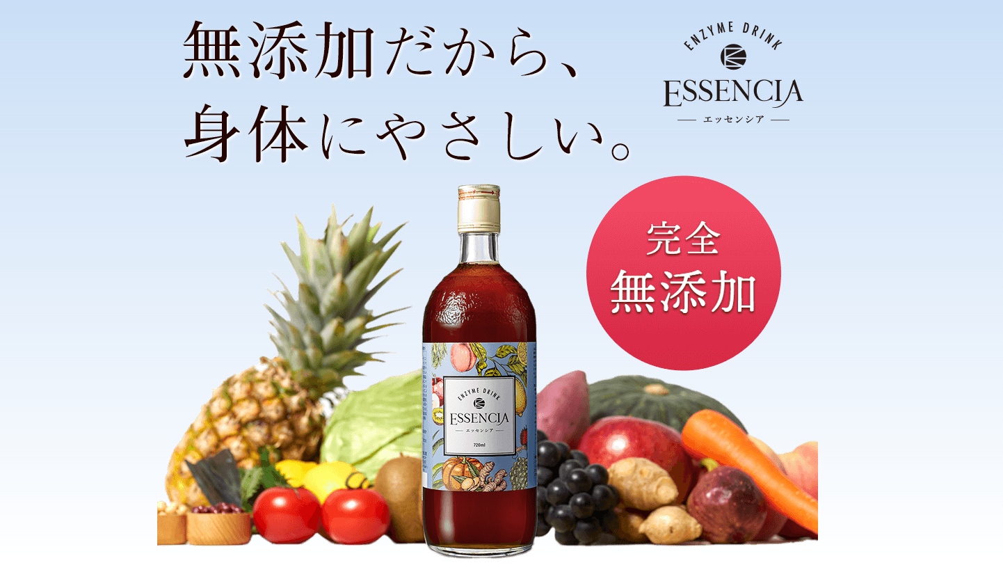 エッセンシア酵素は、安息香酸などの保存料、着色料、香料、人工甘味料を一切使用しない「完全無添加」の酵素ドリンクです。