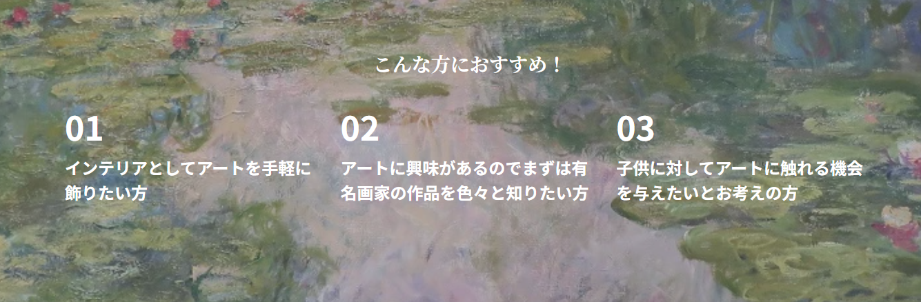 また、飾り方や取り扱い方法についてのガイドも充実しているため、初めてアートを扱う方でも安心して利用できます。