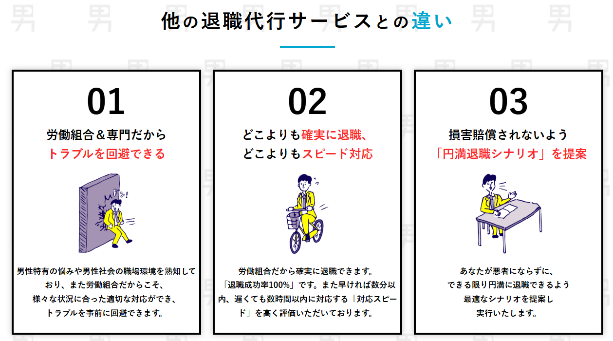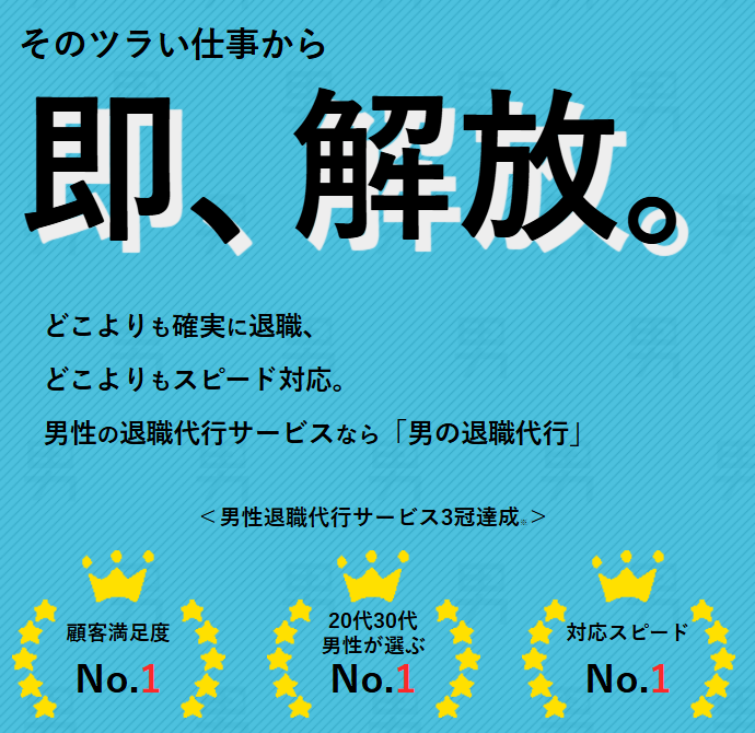 こうしたハードな状況に対応するためには、力強く、かつ法的に正しい手順で交渉を進める専門性が必要です。「男の退職代行」は、そのような男性ならではの厳しい退職事情を熟知しており、確実な退職へと導いてくれます。