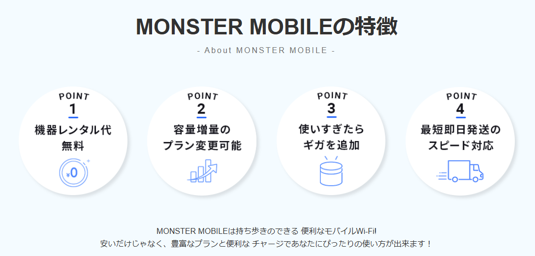 MONSTER MOBILEは、株式会社NEXTが運営するクラウドSIM型のポケットWi-Fiレンタルサービスです。