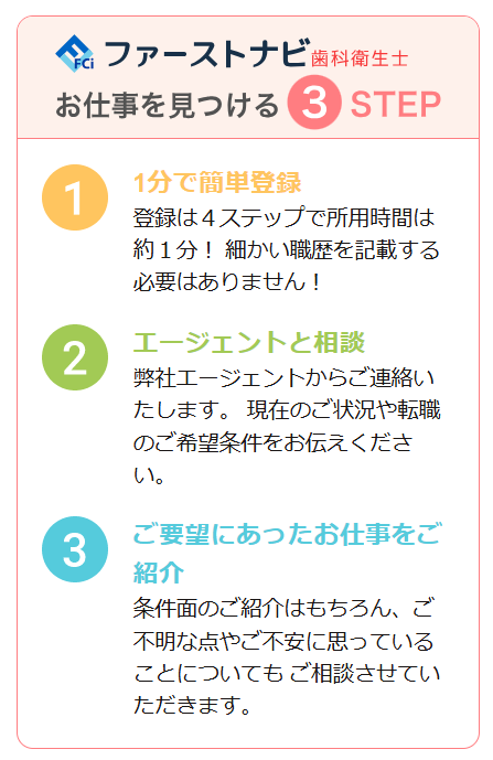 ファーストナビ歯科衛生士は、あなたの理想の働き方を実現するための強力なサポーターです。まずは無料登録をして、非公開求人の情報をチェックしてみてはいかがでしょうか。そこには、あなたがまだ知らない理想の職場が待っているかもしれません。