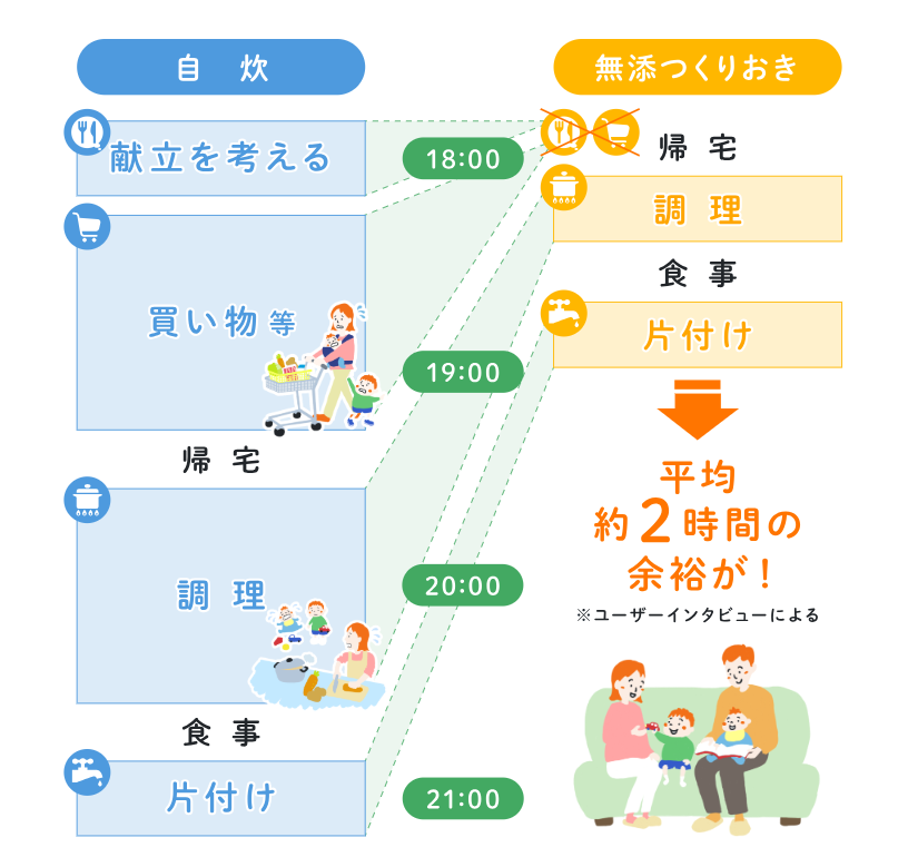 これにより、平日夜のスケジュールに圧倒的な余裕が生まれます。空いた時間を子供との会話や、自分のリラックスタイムに充てることができるのです。