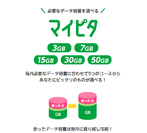 - マイピタ:毎月決まったデータ容量(1GB〜20GB)を使える標準的なプラン。余ったデータは繰り越し可能です。
