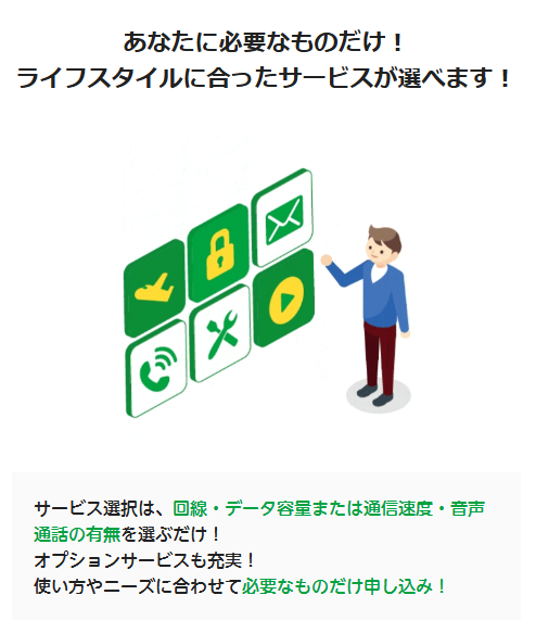 - マイそく:平日のお昼(12時〜13時)の通信速度が厳しく制限される代わりに、それ以外の時間はデータ使い放題(速度制限あり)で、月額料金が非常に安いプラン。