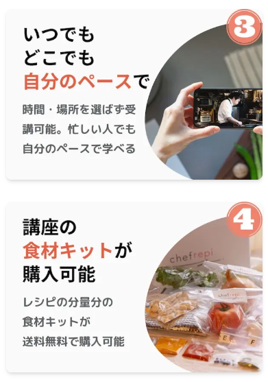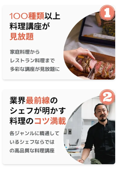 まるでキッチンの隣でシェフに教えてもらっているような感覚で調理が進められます。「なぜこのタイミングで塩を入れるのか」「どうすればお肉がジューシーになるのか」といった料理の理屈(ロジック)も学べるため、受講すればするほど料理の基礎力が向上します。